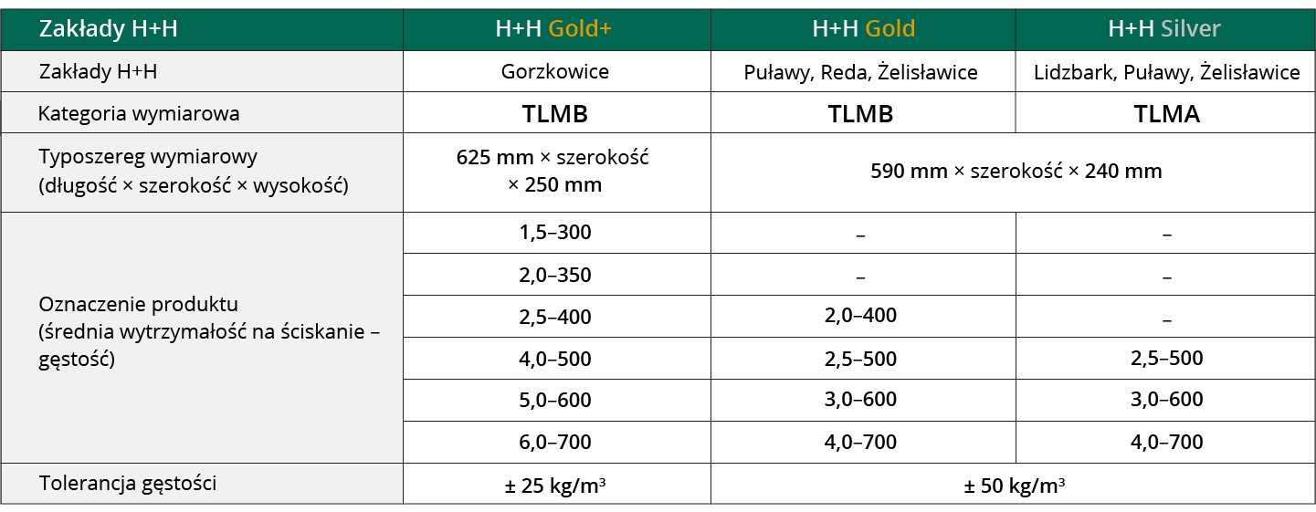 Elementy Systemu Budowy H+H wytwarzane są w trzech standardach jakościowych: Gold+, Gold i Silver.