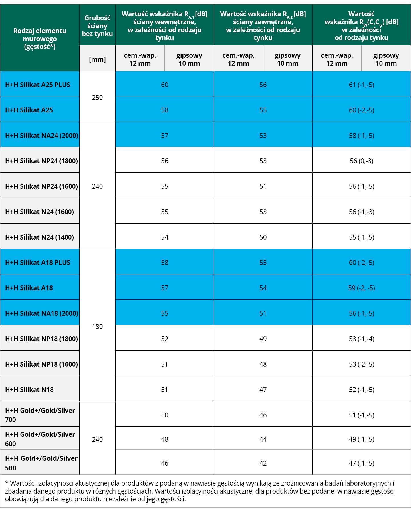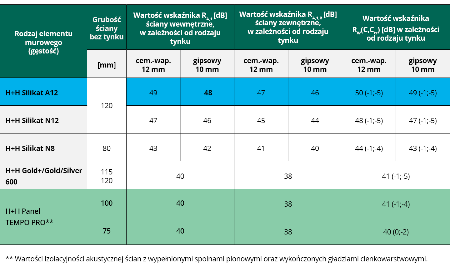 Powyższe wskaźniki dotyczą przegród wzniesionych bez wypełnienia spoiny pionowej dla połączeń pióro-wpust oraz z wypełnieniem spoiny pionowej dla elementów o gładkiej powierzchni czołowej oraz Paneli H+H TEMPO PRO. Jednocześnie wypełnienie spoiny pionowej dla elementów o geometrii pióro-wpust nie spowoduje obniżenia izolacyjności akustycznej ściany. Wskaźnik projektowy RA,1,R uzyskano przez odjęcie 2 dB od wartości wskaźnika RA,1.